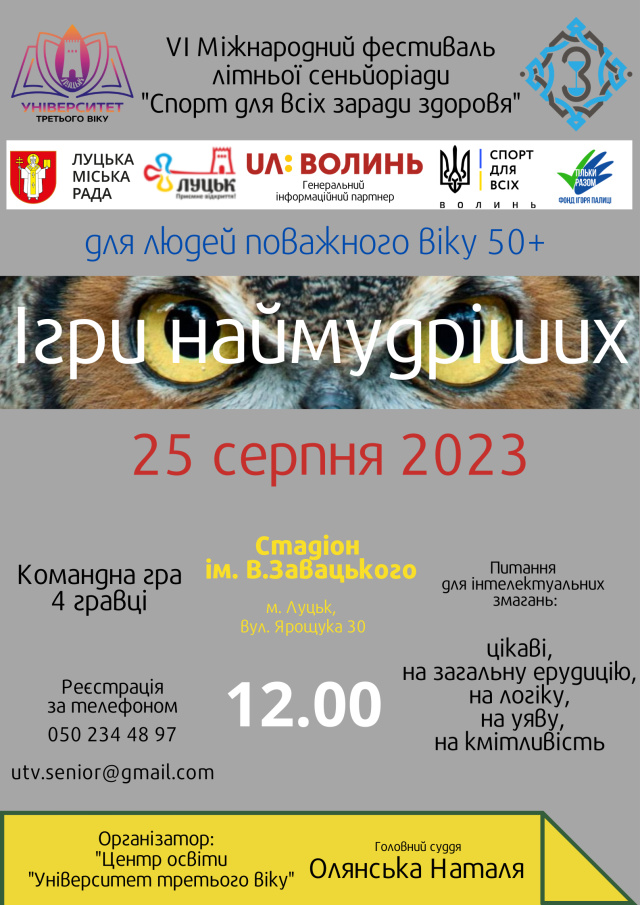 Захід проводять за підтримки Волинської обласної ради, Волинської обласної державної адміністрації, Луцької міської ради, Департаменту культури, молоді та спорту Волинської ОДА, Департаменту соціальної політики Луцької міської ради, Департаменту освіти Луцької міської ради, Фонду Ігоря Палиці «Тільки разом».Фестиваль дасть можливість пропагувати і популяризувати здоровий спосіб життя серед людей поважного віку, формуючи концепцію активної життєвої позиції та довголіття. Це підвищить тривалість життя, наповнить його якісно іншим змістом, зробить яскравим і насиченим.У змаганнях беруть участь люди поважного віку від 50 років і старші, які належать до Університетів третього віку, Територіальних центрів соціального захисту, інших організацій, які працюють зі старшими людьми в Україні та за кордоном.Цього року до участі у фестивалі зголосились учасники з багатьох міст України (Ірпінь, Теребовля, Стрий, Бобринець, Дніпро, Рівне, Львів, Млинів), Волинської області (Ковель, Рожище, Горохів, Торчин, Підгайці) та багато організацій Луцької ТГ. Реєстрація ще триває, тому очікують, що буде близько 300 учасників.
