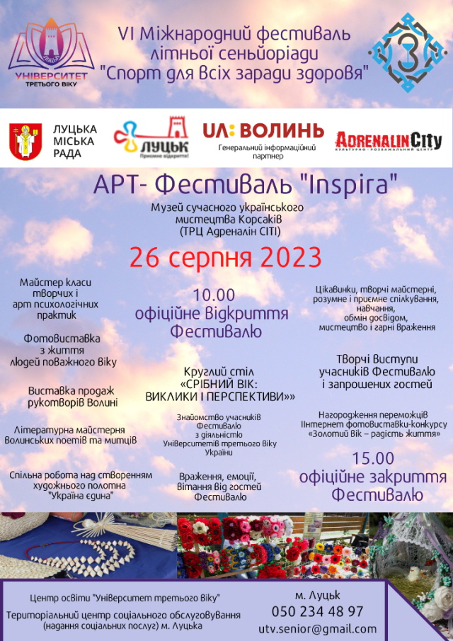 Фестиваль, що вже встиг стати ще однією візитівкою Луцька, відбудеться 25-26 серпня. Його організовує і проводить ГО «ЦО «Університет третього віку». Ця унікальна подія, що не має аналогів в Україні, поєднує цілу низку заходів спортивного, культурного, історичного, розважального, психологічного спрямування, які роблять Луцьк привабливим для туристів і гостей міста, підвищуючи його імідж на національному і міжнародному рівнях.