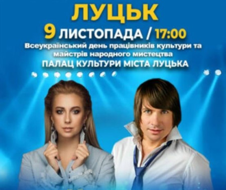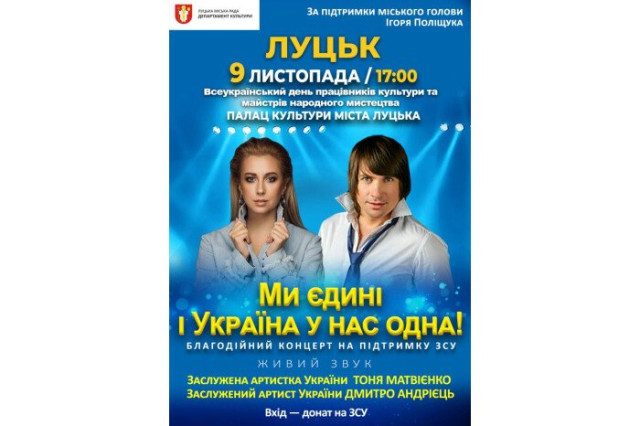 9 листопада, у Всеукраїнський день працівників культури та майстрів народного мистецтва, у Палаці культури міста Луцька відбудеться благодійний концерт «Ми єдині і Україна у нас одна!» за участю заслужених артистів України Антоніни Матвієнко та Дмитра Андрійця.