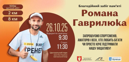 Лучан та гостей міста запрошують взяти участь у благодійному забігу пам’яті Романа Гаврилюка, який відбудеться у Луцьку 26 жовтня. Тренера-викладач Федерації триатлону Волині Романа Гаврилюка загинув на війні з Росією у травні 2024 року.