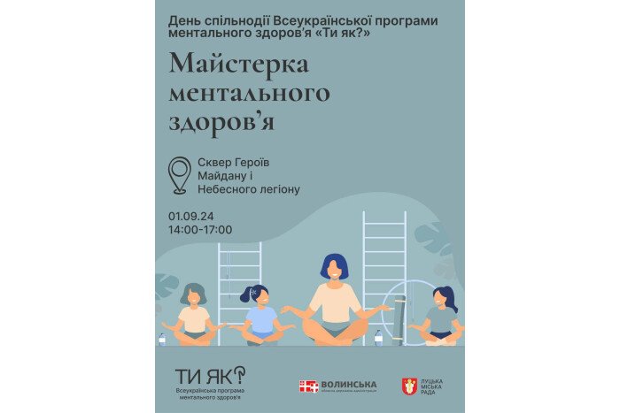 У рамках Всеукраїнської програми ментального здоров’я «Ти як?», що реалізується за підтримки першої леді України Олени Зеленської та Координаційного центру психічного здоров’я при Кабінеті Міністрів України, у Луцьку відбудеться День спільнодії «Майстерка ментального здоров’я».