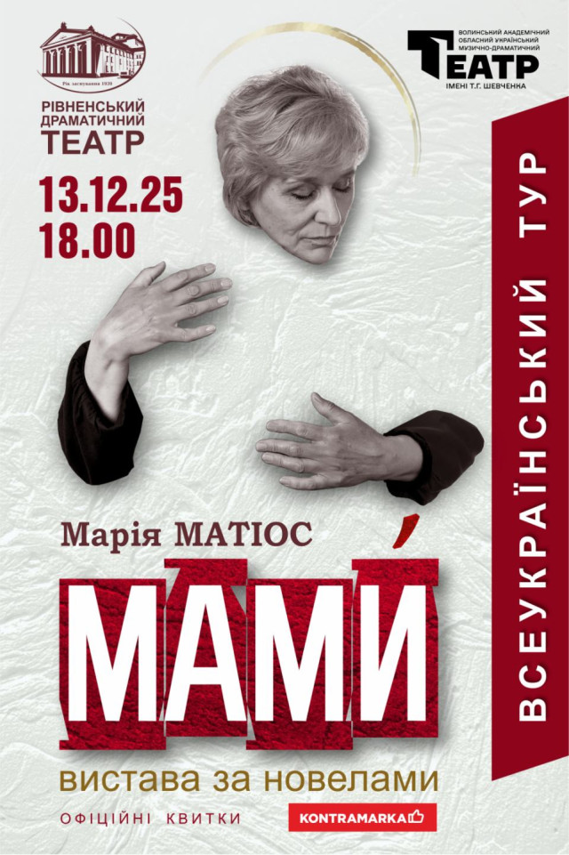 13 грудня у Волинському академічому обласному українському музично-драматичному театрі імені Тараса Шевченка в Луцьку відбудеться унікальна подія: показ вистави «Мами» Рівненського драматичного театру – масштабної постановки, створеної за мотивами збірки новел Марії Матіос. Це всеукраїнський проєкт, адже театр має на меті об’їхати з постановкою усі міста України, де є драматичні театри.