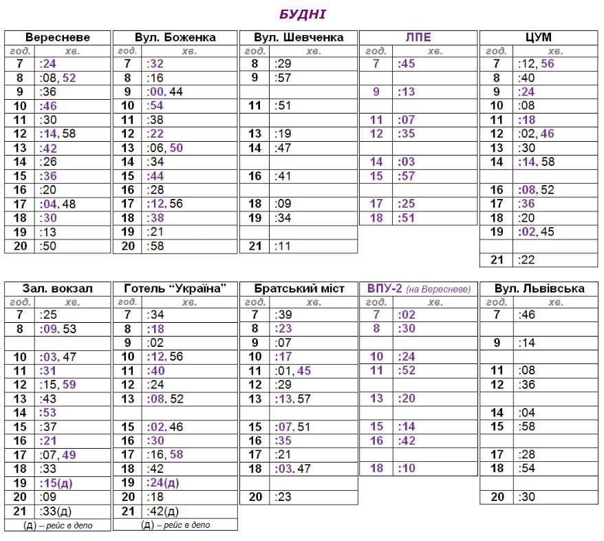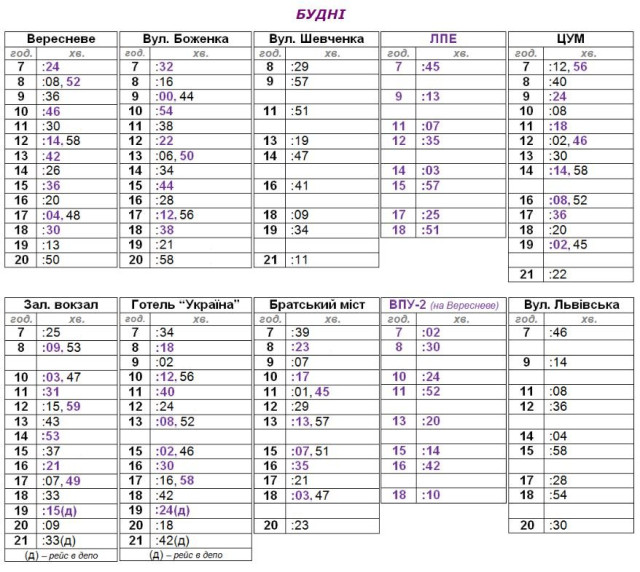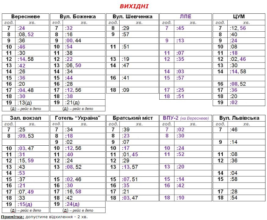 Графік руху тролейбусів № 4 «Вересневе – Залізничний вокзал» (через Ковельську), № 4а «Вересневе – Залізничний вокзал» (через Потебні) – (рейси позначені фіолетовим)