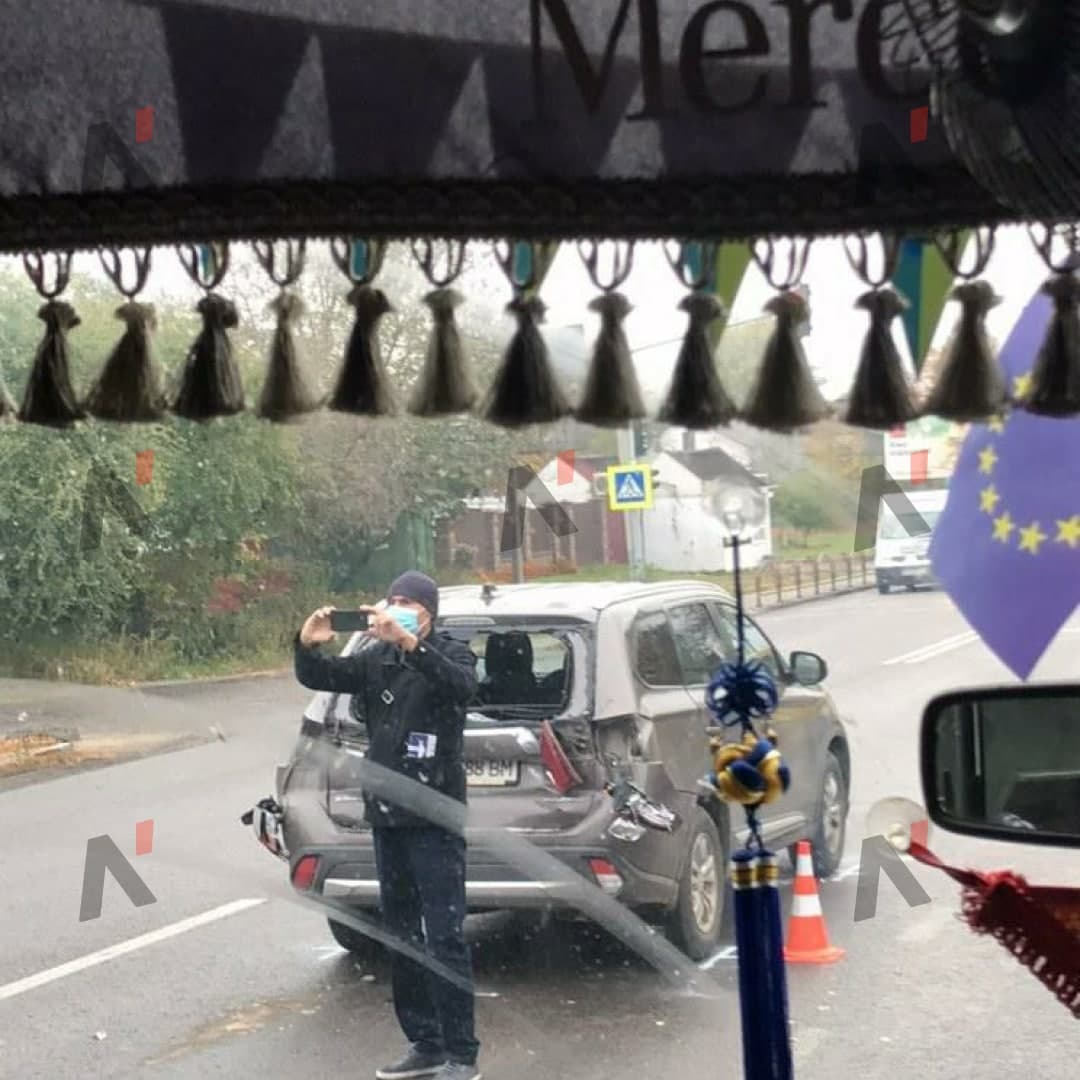 Аварія сталася на вулиці Володимирській. На відео видно, що військова вантажівка врізалася у позашляховик «Mitsubishi», який рухався попереду.