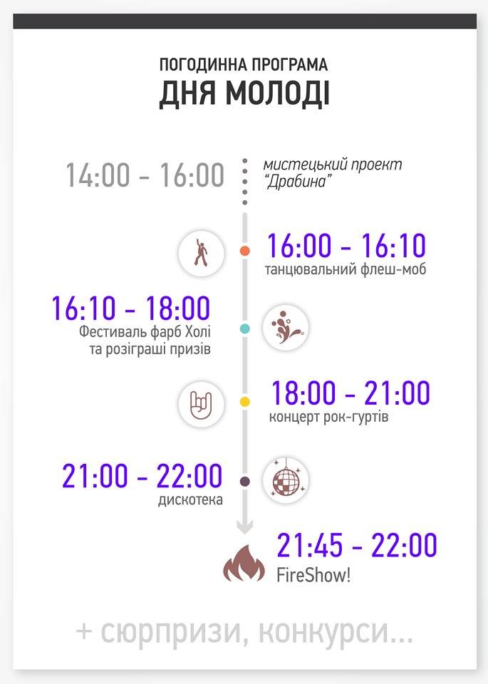 О 16.00 - танцювальний батл, о 16.10 - фестиваль фарб Холі. Далі - концерт, дискотека, а на завершення о 21.45 - вогняне шоу.