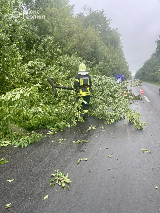 Сьогодні рятувальники 9-ї ДПРЧ м.Горохова ліквідували наслідки грози поблизу с. Скобелка, де на проїжджу частину впало дерево і перекрило рух транспорту, а рятувальники з м.Берестечка розкряжували зламане дерево на одній з вулиць у місті.