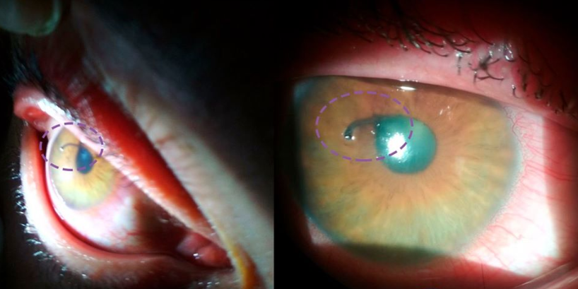 При огляді було виявлено проникаюче поранення із металевим стороннім тілом, один кінець якого знаходився в раневому каналі рогівки, а інший – заходив у кришталик.