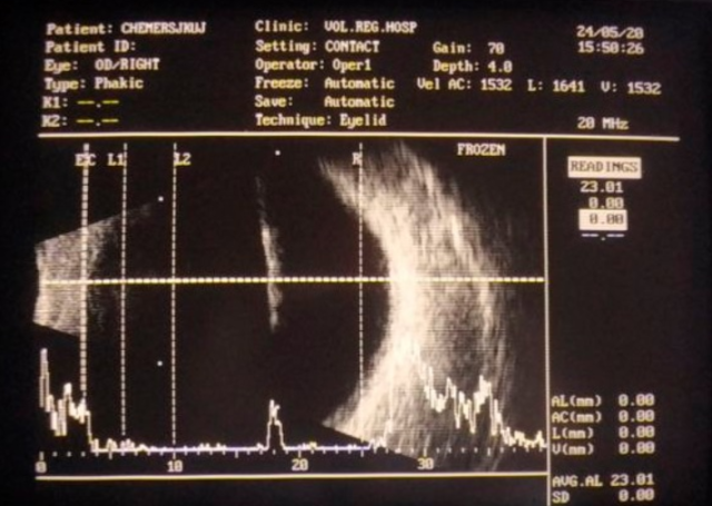 За даними УЗД лікарем Ігорем Стадницьким було з ‘ясовано, що стороннє тіло є досить довгим та проходить в задню камеру ока через весь кришталик.