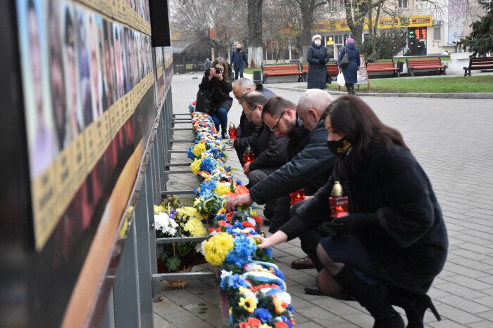 На Театральному майдані учасники заходу поклали квіти до пам’ятного фотостенду «Герої Небесної Сотні — Загинули за Єдність України», а священнослужителі Православної Церкви України відправили панахиду.