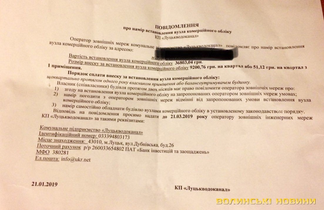 Із початку року лучани почали отримувати повідомлення від КП «Луцькводоканал» про намір встановлення в їхніх будинках вузла комерційного обліку. Пов’язані з цим витрати понесуть власники приміщень або балансоутримувачі будинків. Лічильники мають встановити на всіх житлових будинках до 1 серпня 2019 року.