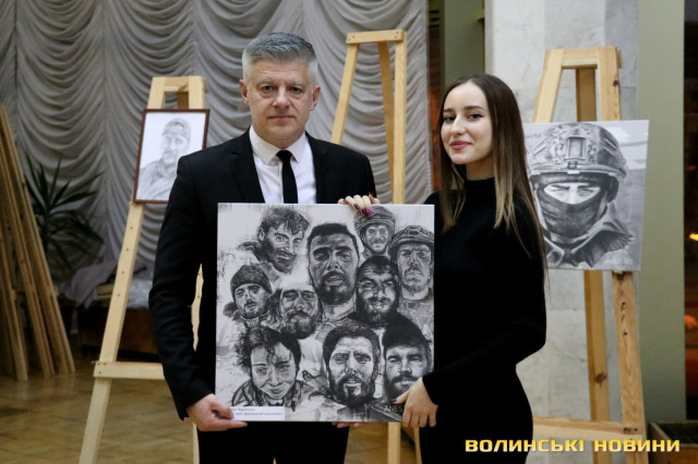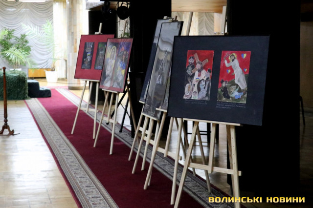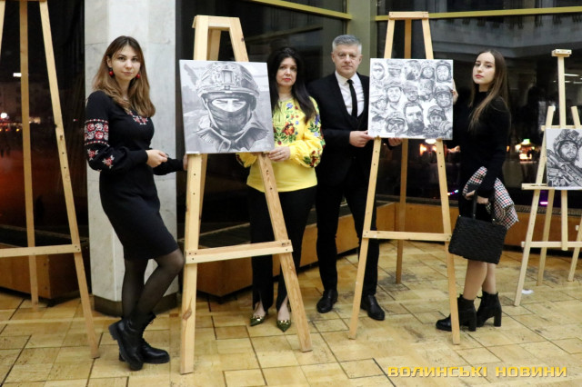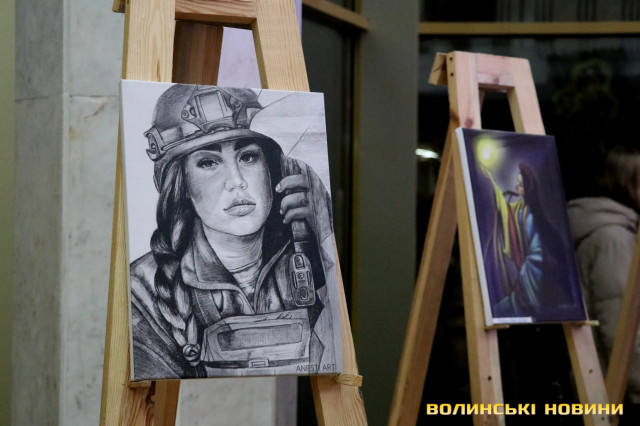 До уваги присутніх було представлено картини художниці з Києва Наталії Мелес та місцевої талановитої художниці Анастасії Куц. Усі роботи присвячені російсько-українській війні. Одну з робіт під час заходу продали на аукціоні за дві тисячі гривень.Роботи луцької художниці вже доволі впізнавані, адже її картини із захисниками України, що героїчно відстоювали Маріуполь, набувають неабиякої популярності серед користувачів соцмереж. Анастасія Куц відзначила, що ця подія для неї є дуже трепетною, адже це перша у її творчості виставка робіт. Особливо вона пишається тим, що її картини несуть у собі соціальну цінність та допомагають наблизити перемогу України.Читати ще: «Весь свій біль я вилила в роботу». Луцька художниця – про портрети захисників Маріуполя, русню у TikTok та Макса Коржа