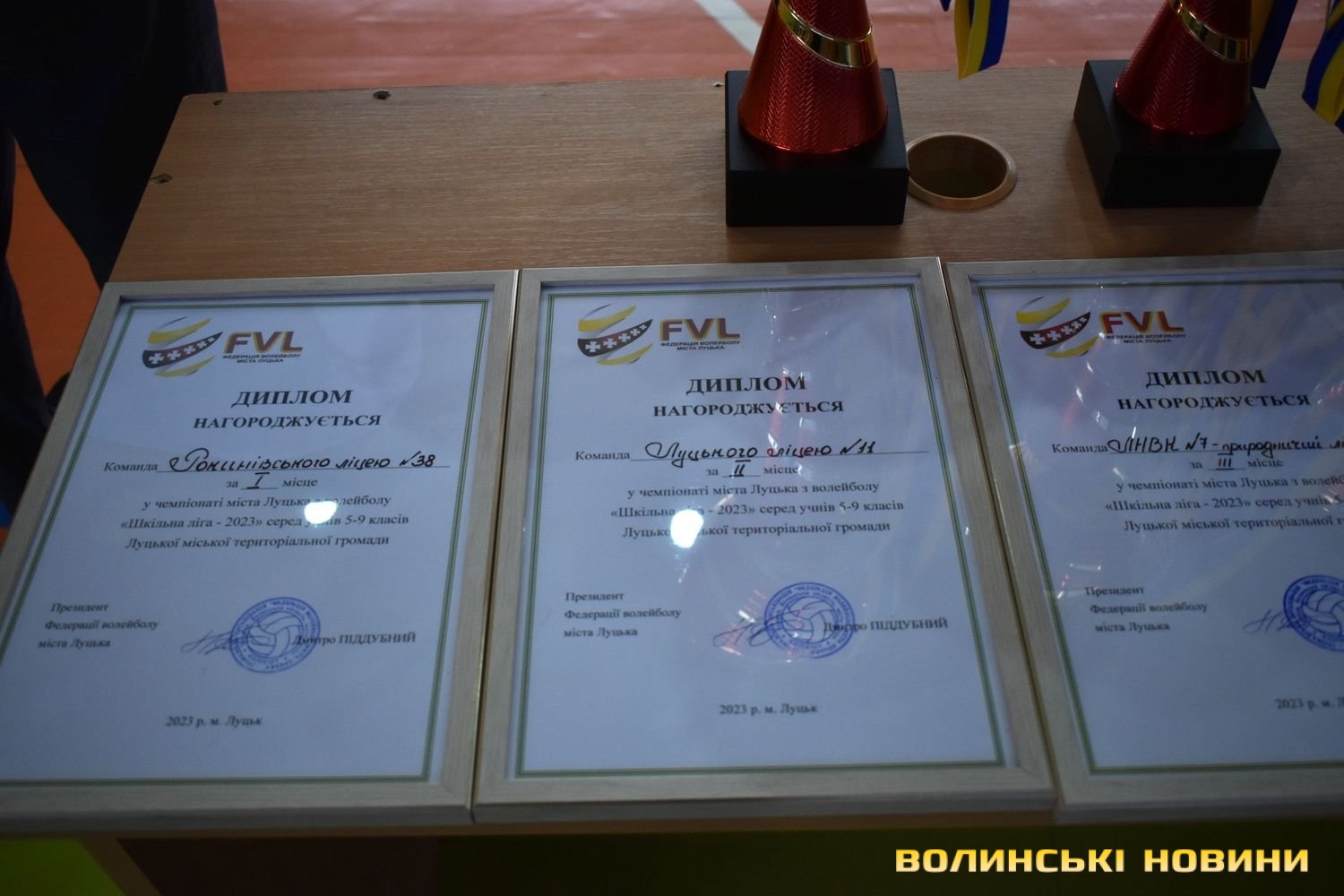 Тож у фінальному протистоянні зійшлися ліцеї № 7, № 11 та № 38. У напруженій боротьбі бронзові медалі дісталися здобувачам освіти ліцею № 7, срібні – одинадцятому. Найбільш вправними виявилися учні ліцею № 38 із селища Рокині.Президент Федерації волейболу міста Луцька Дмитро Піддубний розповів, що на цьогорічній «Шкільній лізі-2023» зібралась рекордна кількість команд. Як додав, організувавши ці змагання, ставили за мету популяризувати здоровий спосіб життя.