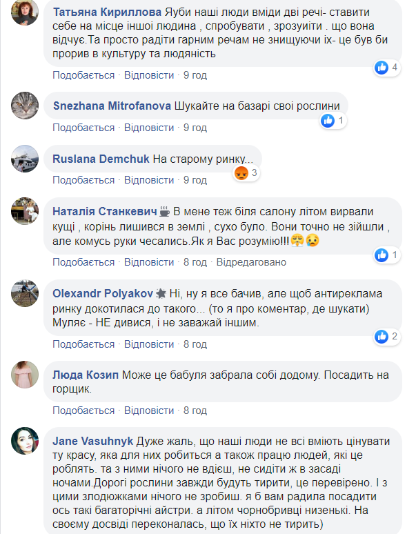 Сподіваюсь, що ці кущі лаванди зігріють чиїсь серця в іншому місці, а не будуть викинуті на смітник...», – йдеться у дописі.У коментарях люди співчувають жінці та рекомендують встановити камери відеоспостереження, аби спіймати вандалів, які псують клумби.