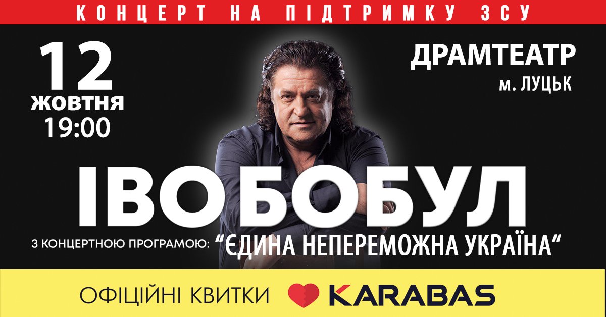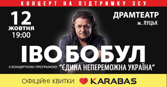 12 жовтня в облмуздрамтеатрі у Луцьку із сольним концертом «Єдина непереможна Україна!» виступить Іво Бобул. Подія відбудеться в рамках всеукраїнського туру артиста, що охопить більше десяти міст. Початок о 19:00.