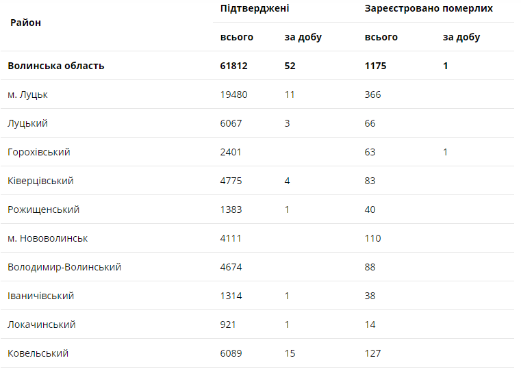 За останню добу на Волині зареєстровано 52 нових підтверджених випадки коронавірусної хвороби COVID-19 (з них дітей – 1, медпрацівників – 2). Одужало за добу – 90 осіб, померла 1 особа.