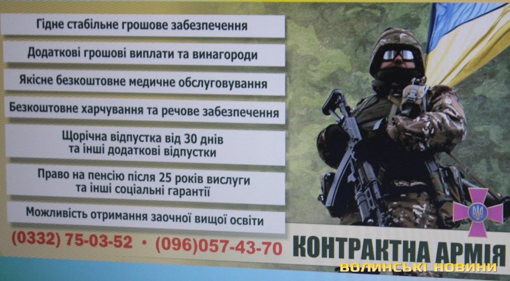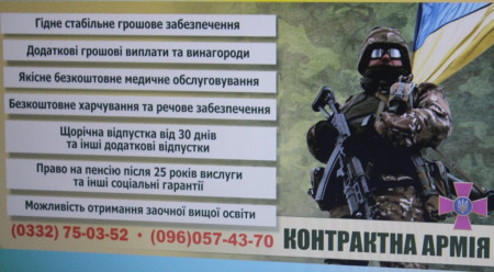 «На білборді буде розміщена інформація, щодо привілеїв військової служби за контрактом. Це і гідне фінансове забезпечення, додаткові виплати та винагороди, безкоштовне медичне обслуговування та харчування, щорічна відпустка від 30 днів, можливість отримання заочної освіти та інше», - повідомив Олександр Ковальський.