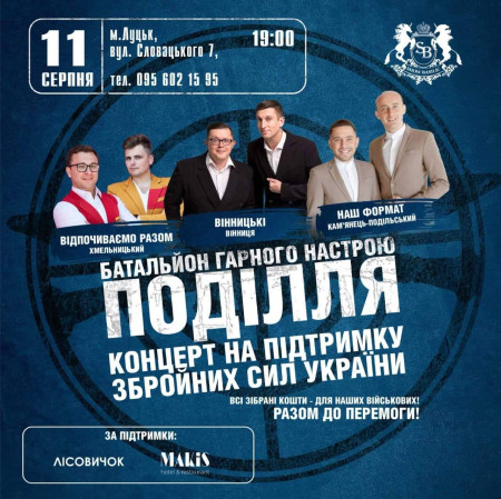 11 серпня в Луцьку у Show Basilic лучан та гостей міста розважатиме «Батальйон гарного бойового настрою ПОДІЛЛЯ». Початок концерту – о 19:00.