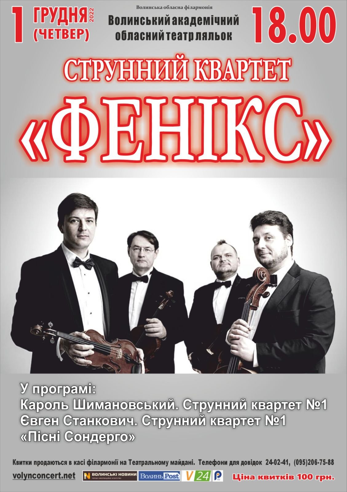 1 грудня 2022 року о 18.00 у Волинському академічному обласному театрі ляльок відбудеться концерт струнного квартету Львівської національної філармонії ім. М. Скорика «Фенікс».