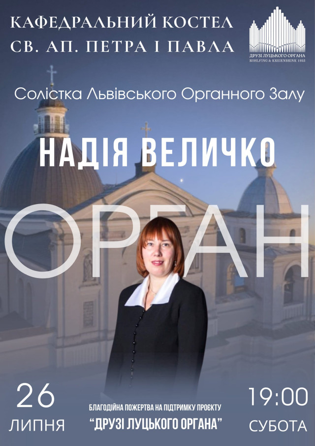 Виконавиця – Надія Величко. Вхід – благодійна пожертва на підтримку проєкту «Друзі Луцького Органа». У випадку повітряної тривоги слухачам буде запропоновано облаштоване укриття.