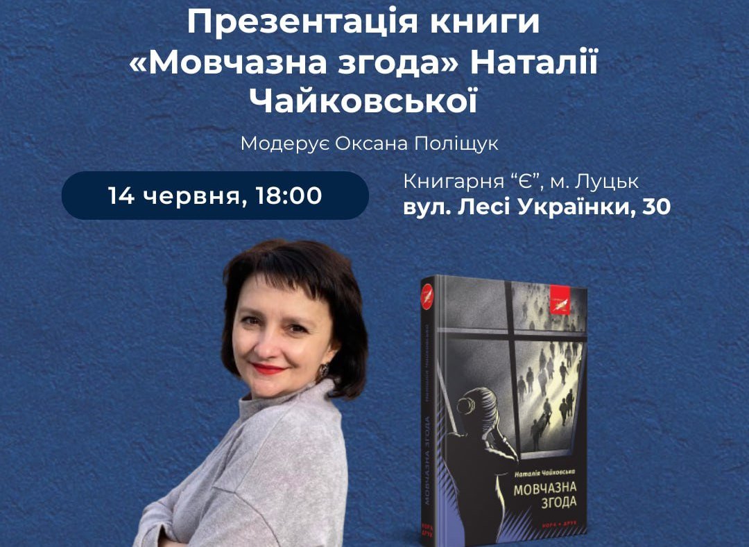 У п’ятницю, 14 червня у книгарні «Є», що на вулиці Лесі Українки, 30 в Луцьку, о 18:00 відбудеться презентація книги «Мовчазна згода» Наталії Чайковської, що вийшла у видавництві «Нора Друк».