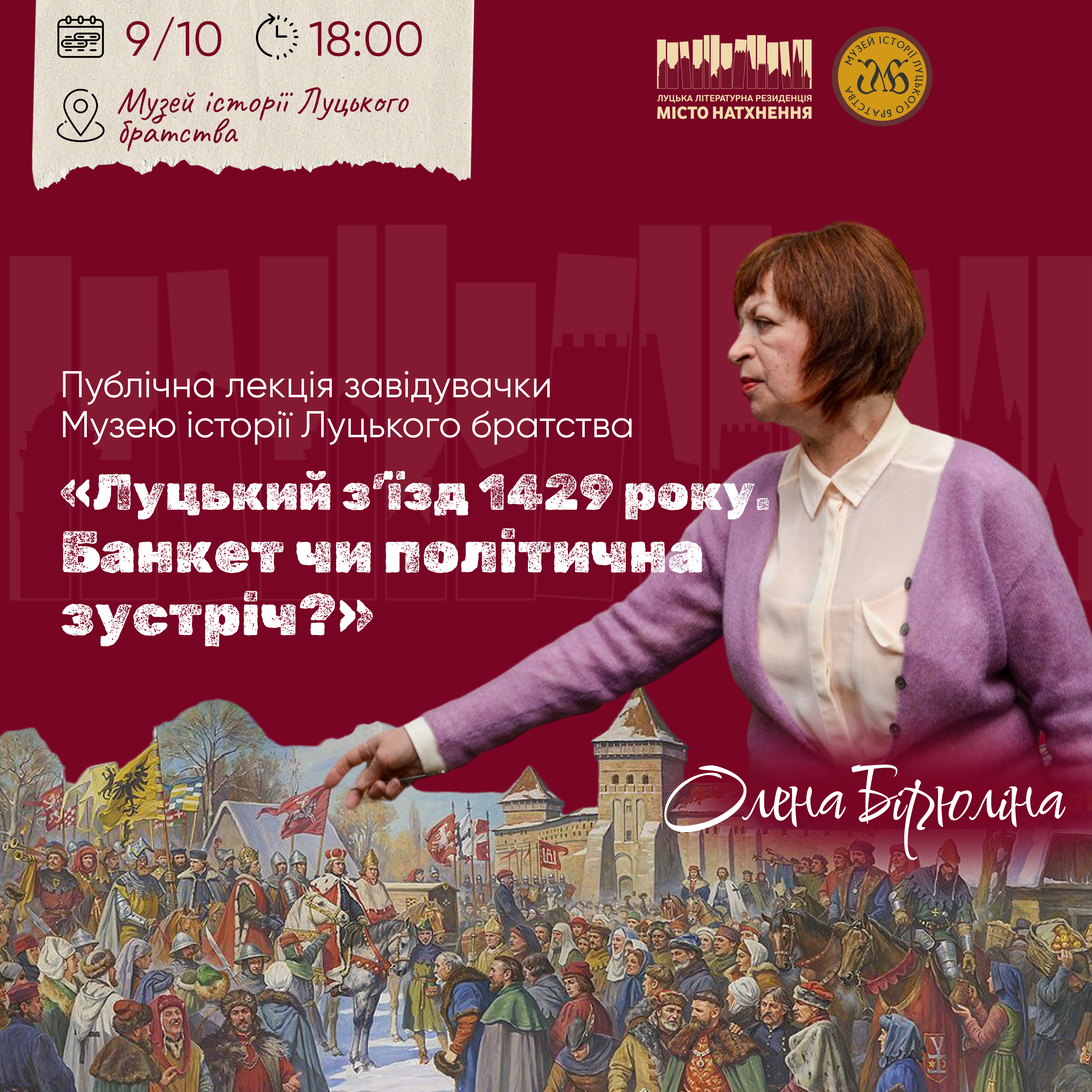 У межах літературної резиденції «Місто натхнення» в Луцьку відбудеться перша публічна лекція «Луцький з’їзд 1429 року. Банкет чи політична зустріч?», яку проведе завідувачка музею історії Луцького братства Олена Бірюліна.