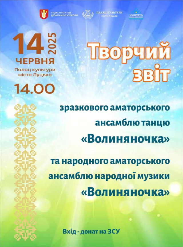 14 червня о 14 годині у Палаці культури міста Луцька відбудеться творчий звіт зразкового аматорського ансамблю танцю «Волиняночка» та народного аматорського ансамблю народної музики «Волиняночка».