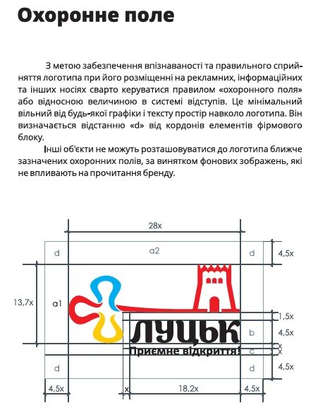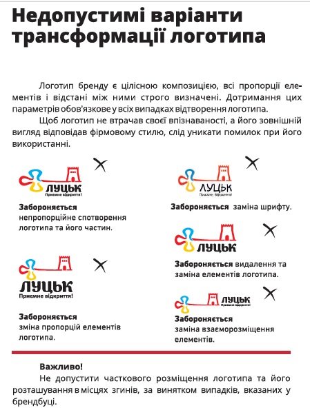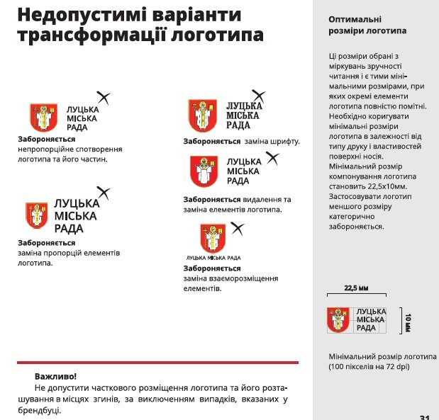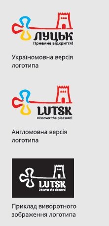 Йдеться також про візуальну ідентифікацію Луцької міськради, наводяться україномовна, англомовна та польськомовна версії її логотипу. Наводять принципи використання логотипів на промоцій ній та рекламній продукції.