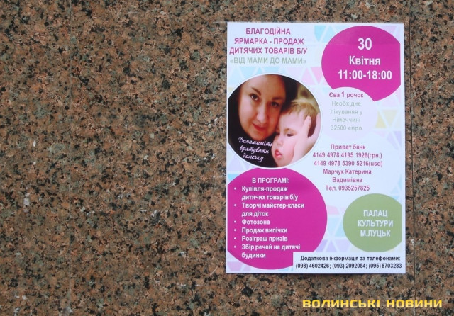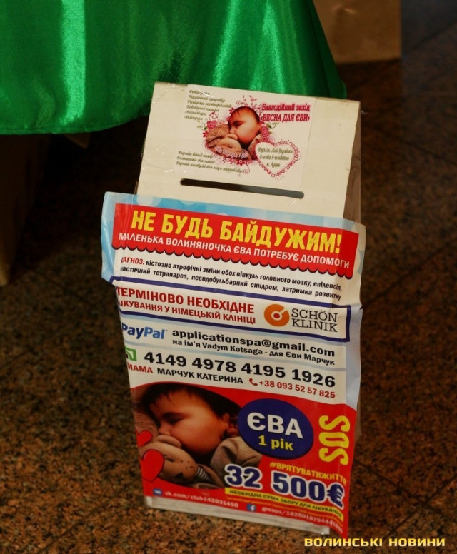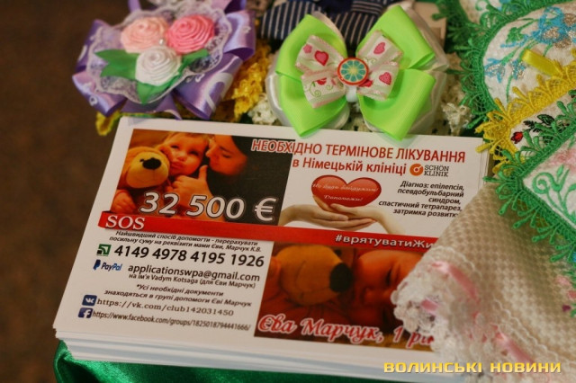 Як повідомила одна з організаторів ярмарку Юлія Онищенко, Єві Марчук, на підтримку якої організовують ярмарок, - один рік. У дівчинки кістозно-атрофічні зміни обох півкуль головного мозку. Зараз вона з мамою перебуває у Києві і потребує 32,5 тисячі євро на лікування в Німеччині. Ярмарки на її підтримку проводили як у Луцьку, так і у Києві. Наразі для дівчинки вдалося зібрати приблизно 200 тисяч гривень.