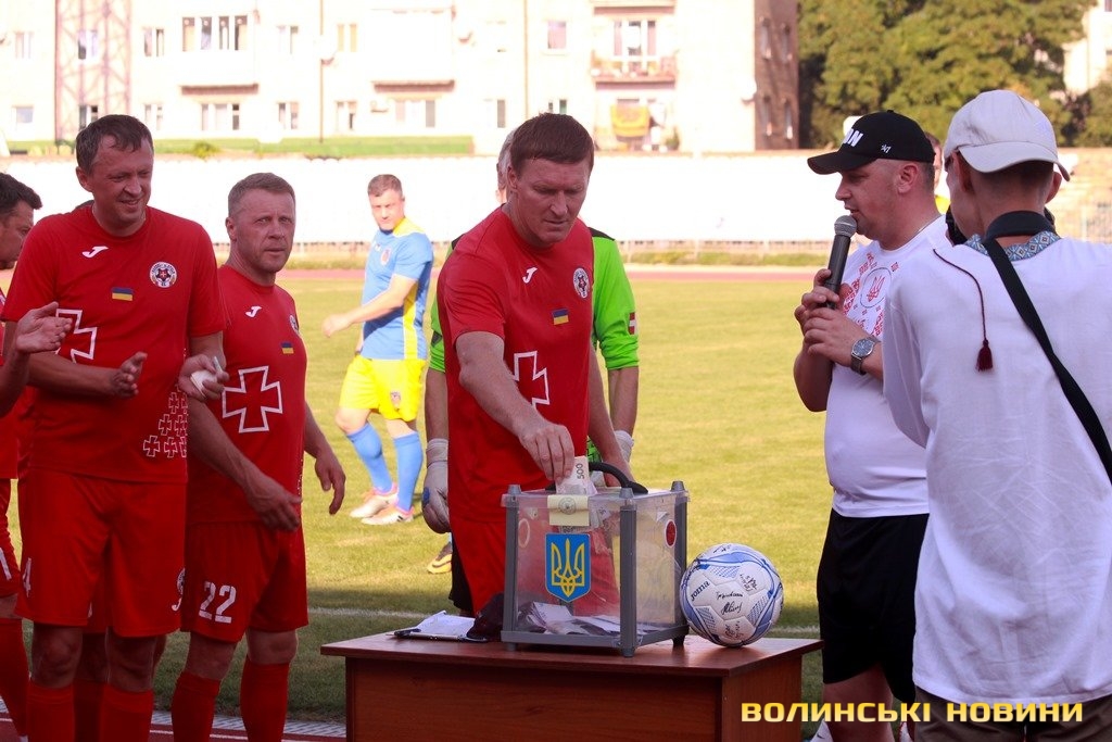У перерві між першим та другим таймом провели аукціон, під час якого троє щасливчиків мали змогу викупити футбольні м’ячі з автографами зірок волинського футболу.Окрім цього, трьом жінкам і трьом чоловікам з трибуни надали змогу спробувати удачу та забити гол воротареві ФК «Волинь» Віталію Недільку. Переможці також отримали у подарунок м’яч із автографами футболістів.І хоч у результаті поєдинок завершився із рахунком 7:4 на користь легенд «Волині», утім перемогли позитивні емоції та донати для ЗСУ.