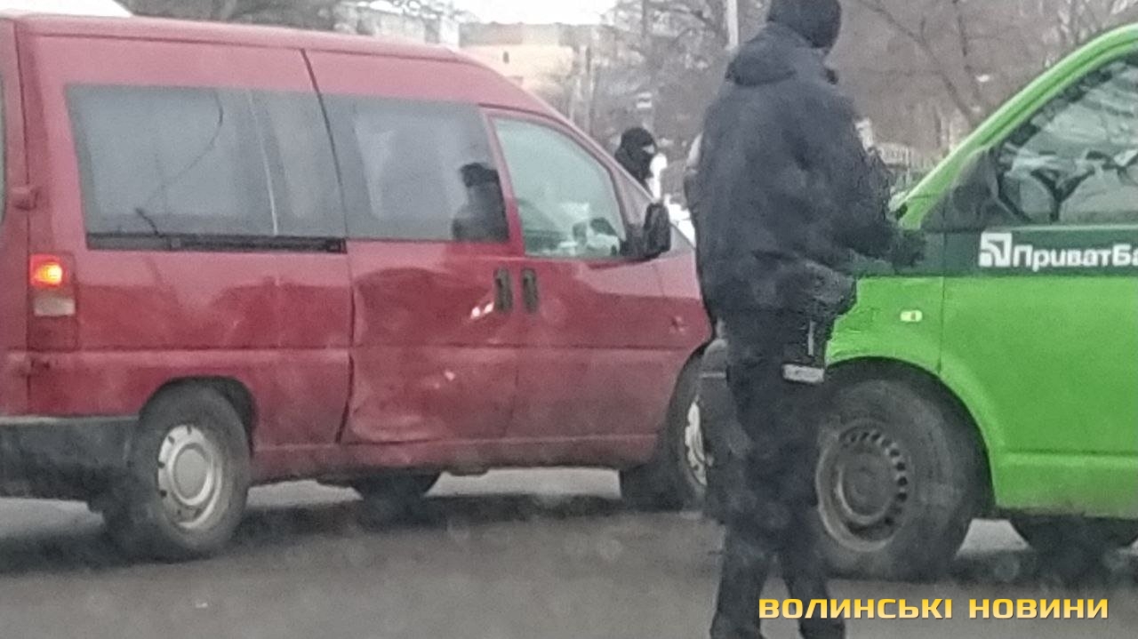 У Луцьку на вулиці Теремнівській сталася дорожньо-транспортна пригода за участі двох автомобілів. Зіткнулися два мікроавтобуси. Один із них – інкасаторське авто «ПриватБанку».