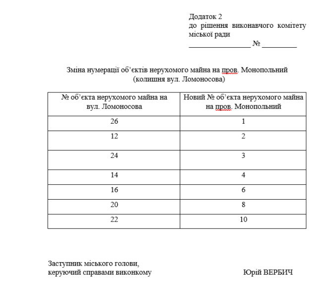 В обласному центрі Волині змінили нумерацію будинків на вулиці Монопольній та провулку Монопольний (колишня вулиця Ломоносова), а також на вулиці В’їзній та провулку В’їзний (колишня вулиця Качалова).
