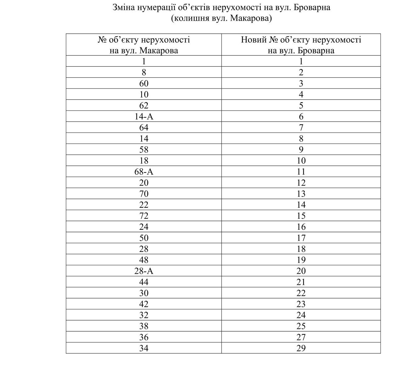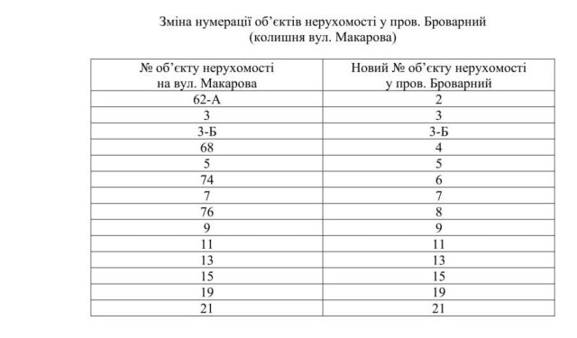 Необхідність зміни нумерації будинків за вказаними адресами виникла через перейменування вулиці Макарова на вулицю Броварну та провулок Броварний.