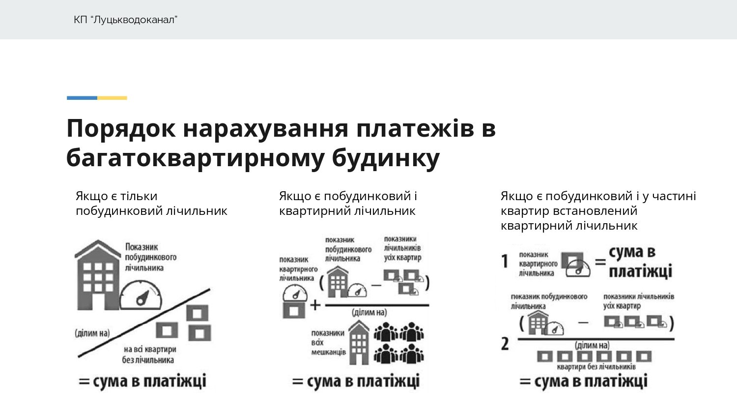 Щоб забезпечити справедливість нарахувань за фактично спожиту послугу водопостачання в багатоквартирному будинку, в Україні введено в дію законодавчі ініціативи на рівні законів, постанов, наказів, які регулюють новий метод нарахувань за послуги водопостачання і водовідведення у багатоквартирних будинках, пояснюють у «Луцькводоканалі».