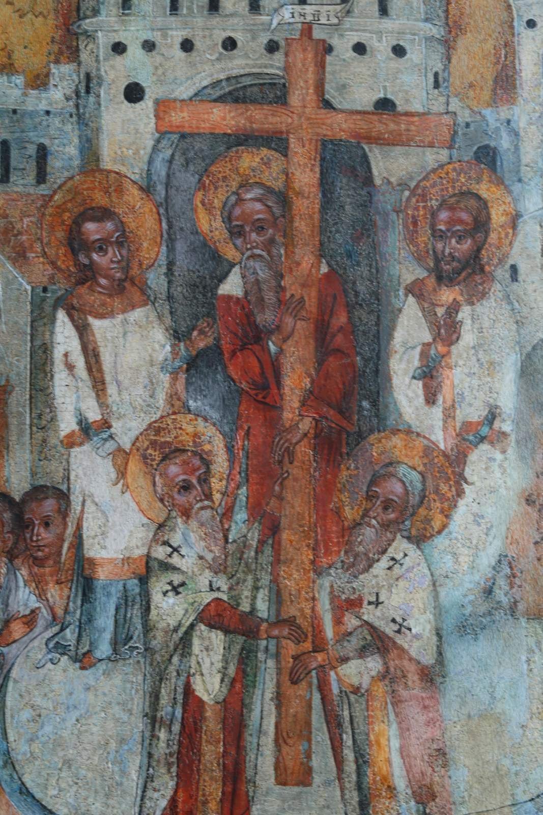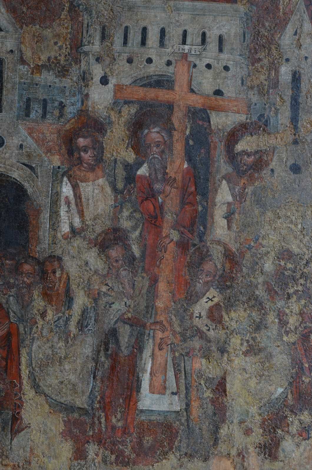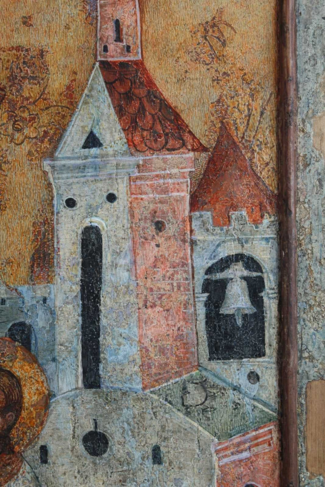Нижня частина ікони найбільш постраждала від часу. Серед натовпу виділяється постать царя Костянтина. В іконі, як і у інших творах майстра, велика роль відводиться архітектурі. Масивні споруди з центральним храмом, двома вежами і дзвіницею з підвішеним дзвоном з’єднані високими стінами. Стіни храму та веж іконописець прикрашає ледь прописаними карнизами, пілястрами, круглими та аркоподібними вікнами. Колорит пам’ятки відповідає іншим творам маляра. Тут домінує вохра різних відтінків, біла та блакитна фарби. Тонка чорна лінія окреслює лики і постаті персонажів.
