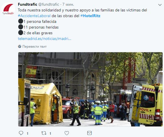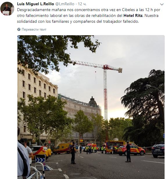 У мадридському готелі «Ritz» внаслідок обвалення будівельних конструкцій один робітник загинув, ще одинадцятеро постраждали.