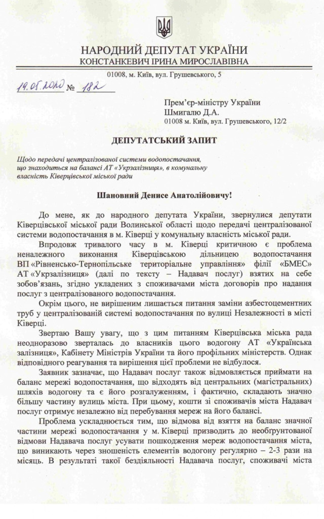 Народна депутатка Ірина Констанкевич скерувала депутаські запити до очільника уряду Дениса Шмигаля, міністра інфрастуктури України Владислава Криклія та до в.о. голови правління АТ «Українська залізниця» Івана Юрика, у яких вимагає вжити заходів для передачі централізованої системи водопостачання, що знаходиться на балансі АТ «Укрзалізниця», в комунальну власність міської ради.