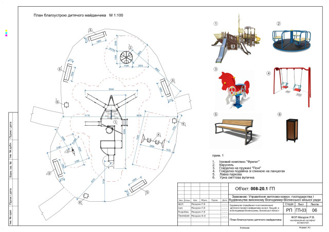 Будівництво дитячого ігрового майданчика включатиме копання ям для стояків і стовпів, улаштування фундаментів, встановлення анкерних болтів при бетонуванні у вигляді зварених каркасів, монтаж ігрового обладнання без механізмів на відкритій площадці, зокрема ігрового комплексу «Фрегат», каруселі, гойдалок, монтаж трьох сміттєвих урн, п’яти паркових лавочок тощо.Усі роботи мають завершитися до 1 листопада 2021 року. Гарантійний термін експлуатації об’єкту становитиме не менше двох років. Протягом цього часу підрядник має здійснювати гарантійне обслуговування конструкцій майданчика.