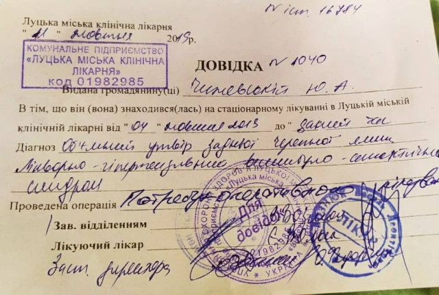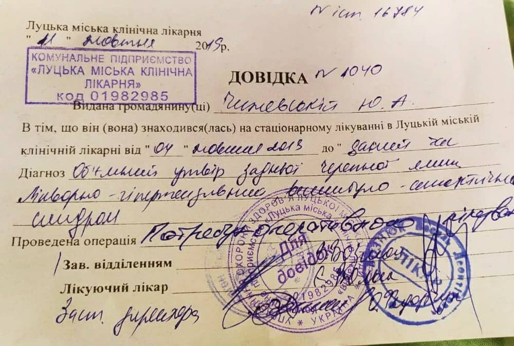 Дівчина скаржилася на нудоту, блювоту, запаморочення, неможливість самостійно ходити. Невропатологом була скерована в Луцьку міську клінічну лікарню на обстеження, де, за результатами МРТ, у неї виявили пухлину. Пацієнтку перевели в нейрохірургічне відділення, однак прооперувати Юлію в умовах цього медзакладу можливості немає через відсутність спеціального мікроскопа.