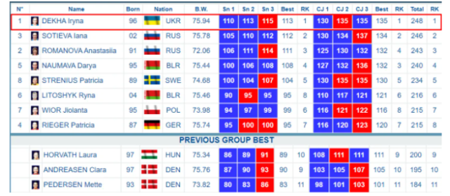 Українка в боротьбі за титул найсильнішої важкоатлетки континенту випередила росіянок Яну Сотієву (246 кг за сумою двоборства) і Анастасію Романову (243 кг).