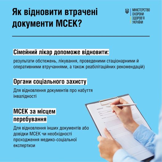 - Для відновлення інших документів або довідки МСЕК чи необхідності проходження медико-соціальної експертизи можна звернутися до медико-соціальної експертної комісії за місцем перебування, і лікарі МСЕК спільно з лікарями закладів охорони здоров’я підкажуть способи розв’язання проблемних питань.