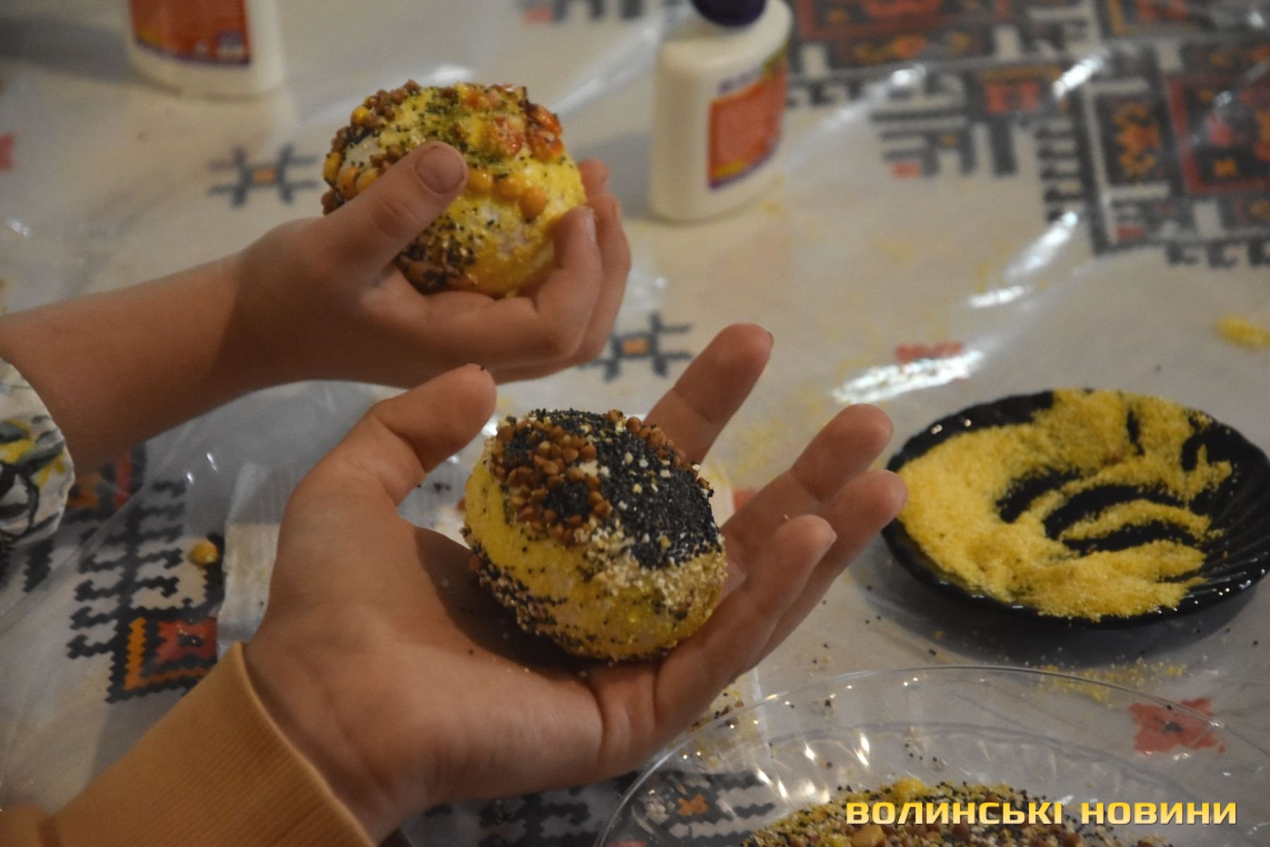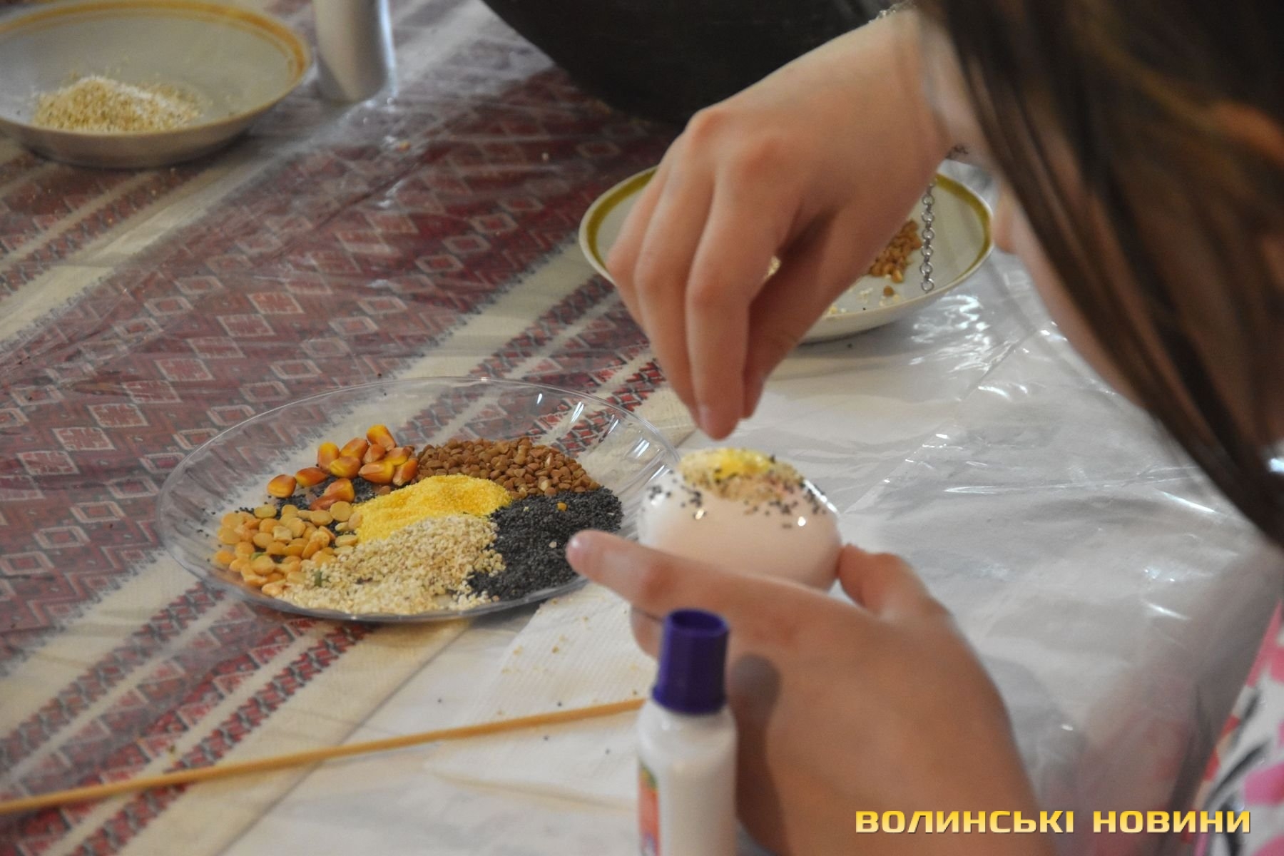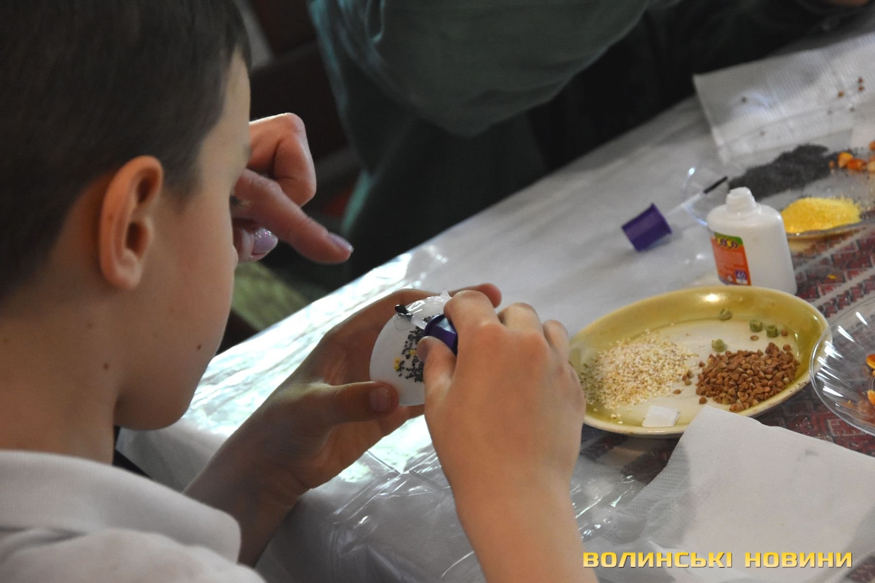 «Ставили за мету показати дітям писанкарство минувшини, адже писанка-зернівка була ще за часів Трипілля. Ми декоруємо яйце зерном і насінням, які мають свою символіку. Наприклад, мак – це пам’ять про воїнів, про предків, яку ми зберігаємо. Також прикрашаємо горохом, бобовими культурами, що означають здоров’я, і гречка – щоб не було в сім’ї суперечки», – поділилася Ольга Романюк.Читати ще: Робототехніка та природознавство: у Луцьку діти військових та переселенців спробували себе в науці. Фото