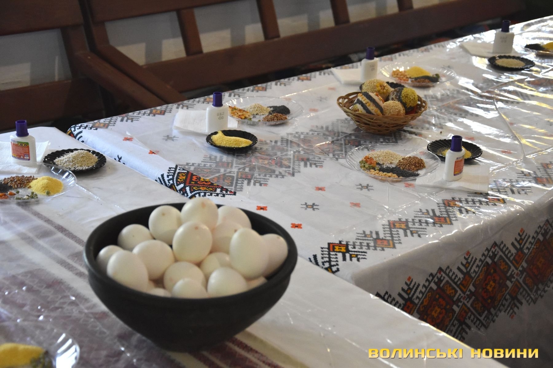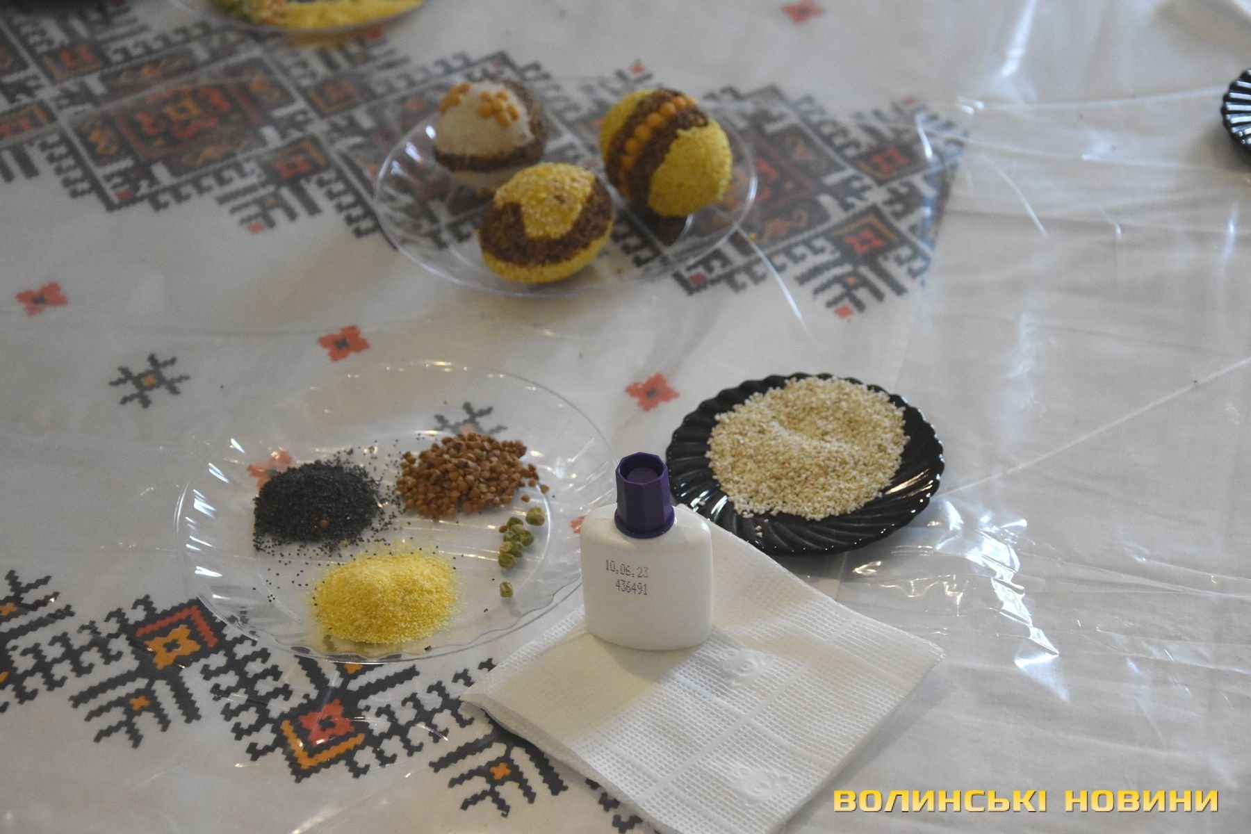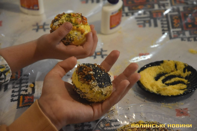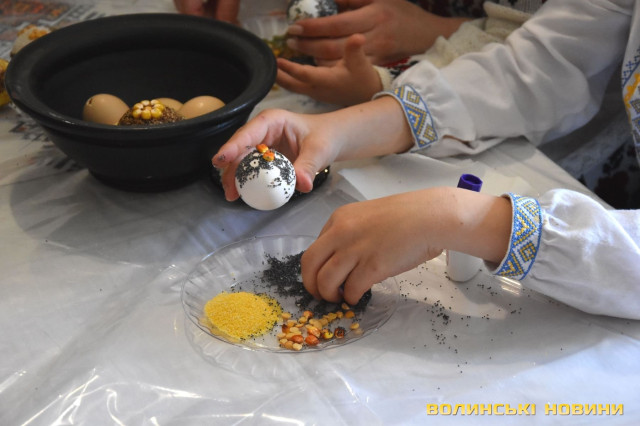 «Ставили за мету показати дітям писанкарство минувшини, адже писанка-зернівка була ще за часів Трипілля. Ми декоруємо яйце зерном і насінням, які мають свою символіку. Наприклад, мак – це пам’ять про воїнів, про предків, яку ми зберігаємо. Також прикрашаємо горохом, бобовими культурами, що означають здоров’я, і гречка – щоб не було в сім’ї суперечки», – поділилася Ольга Романюк.Читати ще: Робототехніка та природознавство: у Луцьку діти військових та переселенців спробували себе в науці. Фото