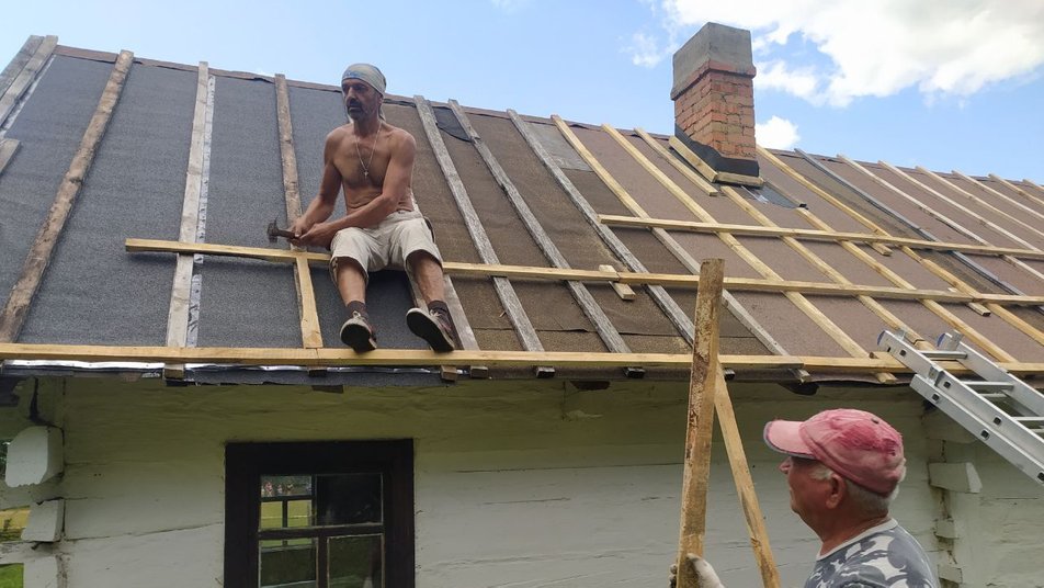 «Дах двохсотлітньої хати перекривають снопами з очерету. Щоб звязати один такий, потрібно витратити дві з половиною години», – розповідає робітник Дмитро Шрамко. Каже: щоб перекрити такий дах, потрібно лише на одну сторону 40 снопів очерету.«Очерет заготовили самі. Роботу почали три тижні тому. Перед тим, як класти снопи з очерету, будівлю перекрили спеціальними рулонними матеріалами», – каже робітник Роман Мишко.