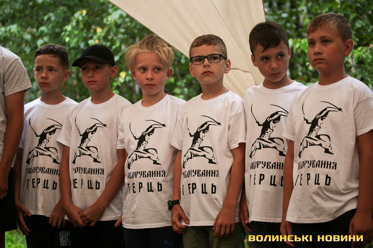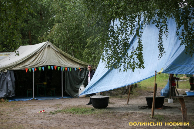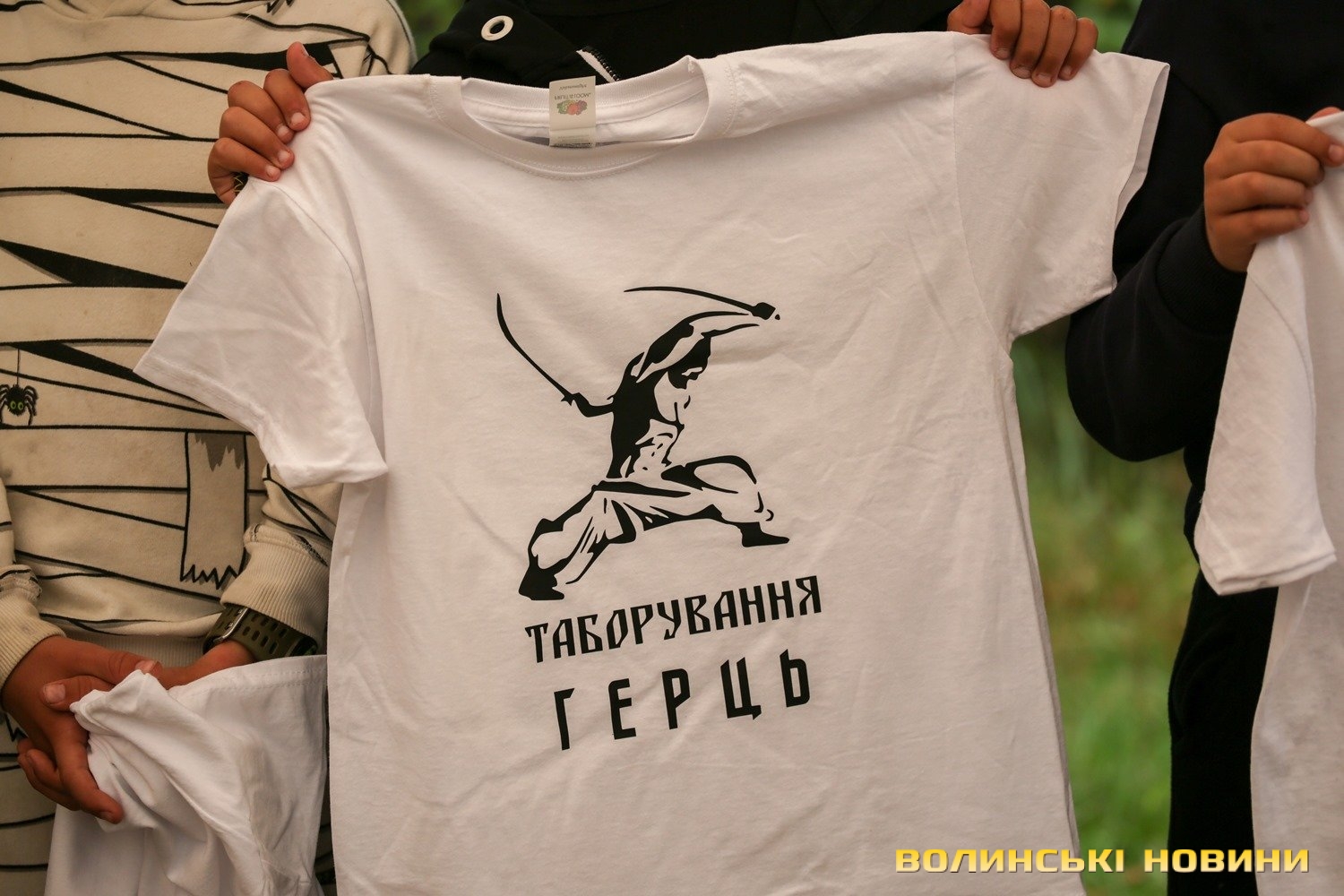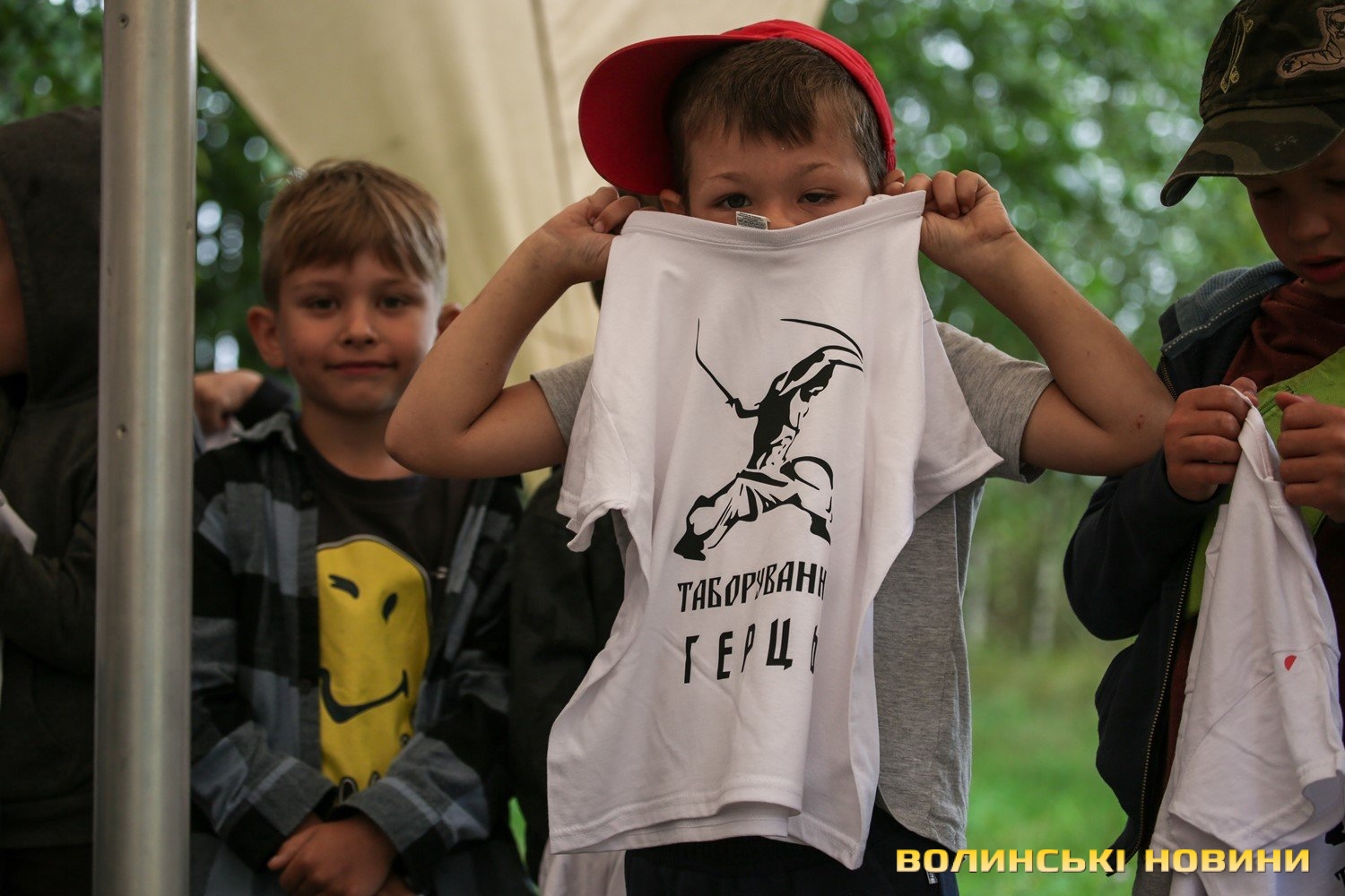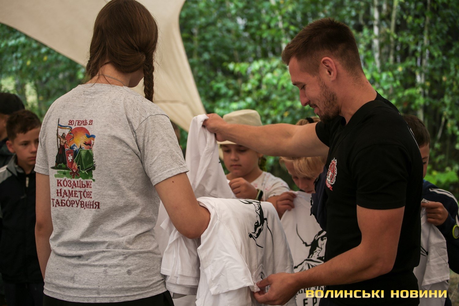 Долучився до проведення табору і Фонд Ігоря Палиці «Тільки разом», який подарував дітям футболки, що символізують їхню участь у козацькому вишколі.Загалом козацьке наметове таборування триває протягом десяти днів. Під час першого заїзду таборувалися 54 дитини, другого – 74 дитини, а нині у наметах живуть 46 дітей. Серед них – ті, хто втратив батьків під час війни, діти військовослужбовців, діти внутрішньо переміщених осіб та діти, які просто захотіли пройти козацький вишкіл.«Таборування передбачає пристосування до польових умов, тому діти беруть участь в організації табору. Вони допомагають на кухні, збирають дрова, приносять воду, тобто навчаються бути дисциплінованими та самостійними. За певну роботу отримують козацькі гривні, які зможуть витратити на розваги або ж на аукціоні наприкінці таборування. Також програма передбачає різні локації та квести, зокрема стрільбу з лука, пневматичної зброї, метання ножів та гончарство. Окрім того, діти грають козацькі ігри, проходять вишкіл. До нас навіть приїжджають лицарі, які показують майстер-клас», – розповів керівник Музею історії сільського господарства Волині-скансен Роман Ковальчук.Фонд Ігоря Палиці «Тільки разом» завжди долучається до хороших ініціатив музею-скансену, цей випадок не став винятком, адже нині діти військовослужбовців потребують особливої уваги.