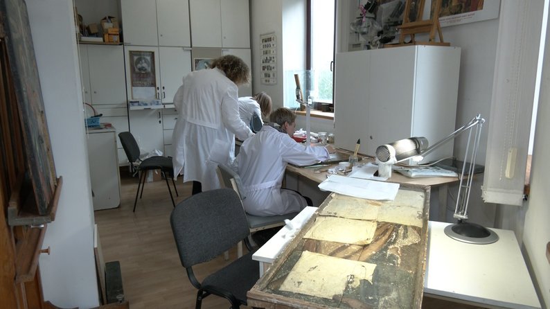 «Весь живопис фактично посипався, вона у фондах в горизонтальному положенні зберігалася, її неможливо було поставити вертикально. Це як пазл», – каже Роксолана Мокрій.Як розповів Тарас Откович, керівник Львівської філії Національного науково-дослідного реставраційного центру України, така виїзна робота стала можлива завдяки міжнародній допомозі.