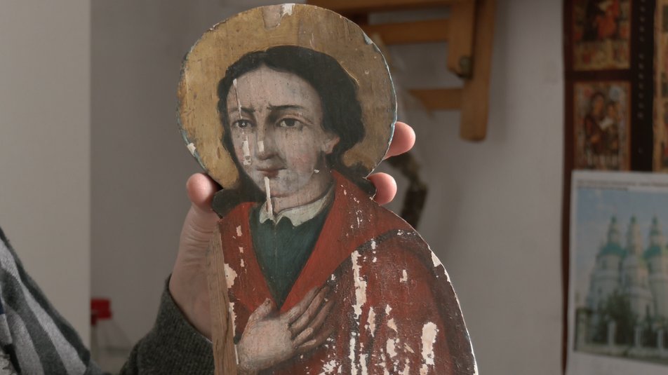У Богородиці і в Іоанна промальовуються великі, виразні сльози: «То є Голгофа, коли по контуру вирізаються фігури розп’яття Ісуса Христа й обабіч нього стоять Богородиця печальна та Іоанн Хреститель з іншої сторони», – говорить Лариса Обухович.Як розповіла реставраторка, центральний елемент образів – розп’яття, втрачено. Також немає частини зображення Іоанна Хрестителя: «Шашелю не видно. Але живопис мав дуже багато втрат. Оці білі вставки, це вже реставраційне втручання».