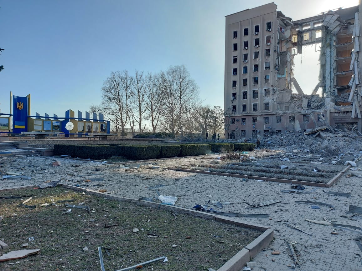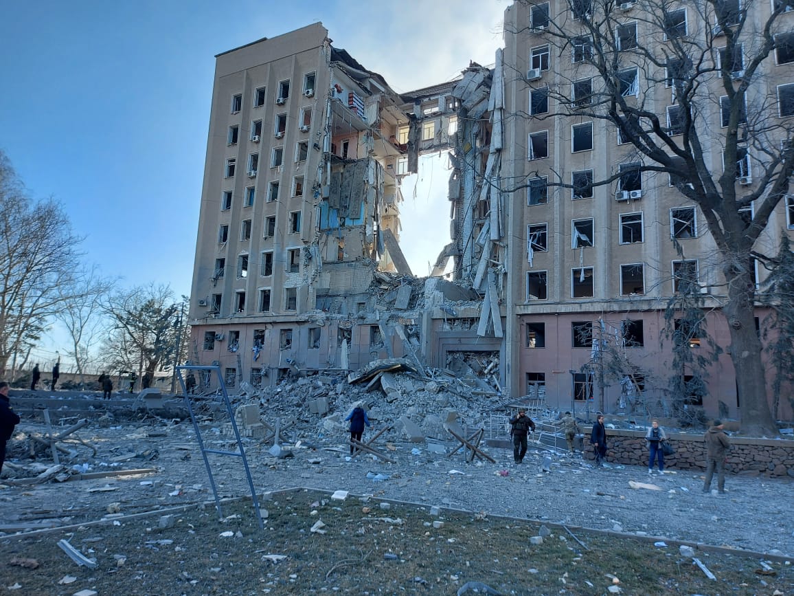 Як повідомили у ДСНС, окупанти влучили в дев’ятиповерхову адміністративну будівлю близько 8:45. Внаслідок цього сталося руйнування центральної секції будівлі з дев’ятого до першого поверха.