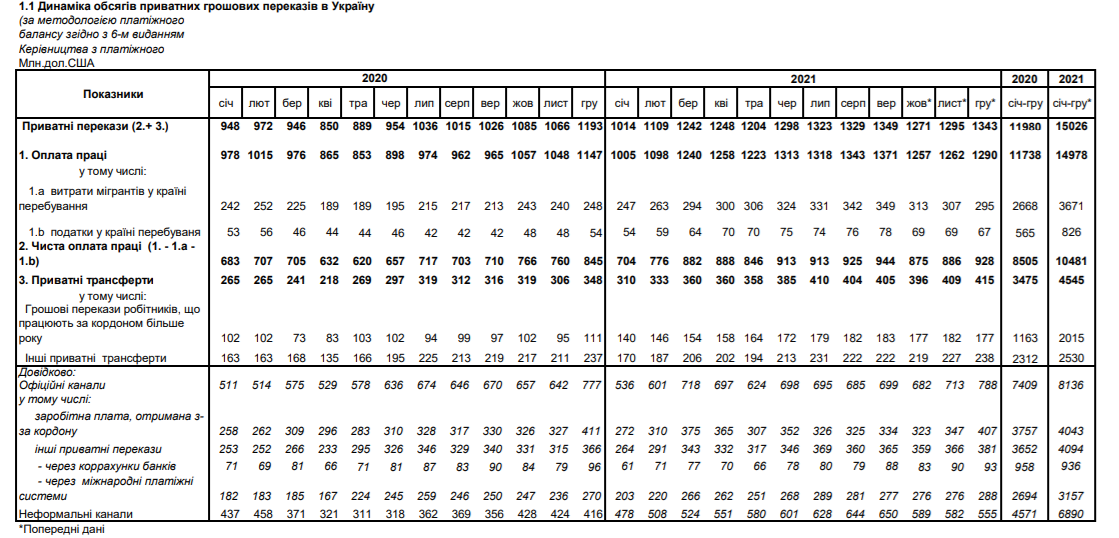 Обсяг приватних грошових переказів в Україну за 2021 рік склав 15,03 млрд доларів, що на 25% більше, ніж за попередній рік (11,98 млрд доларів).