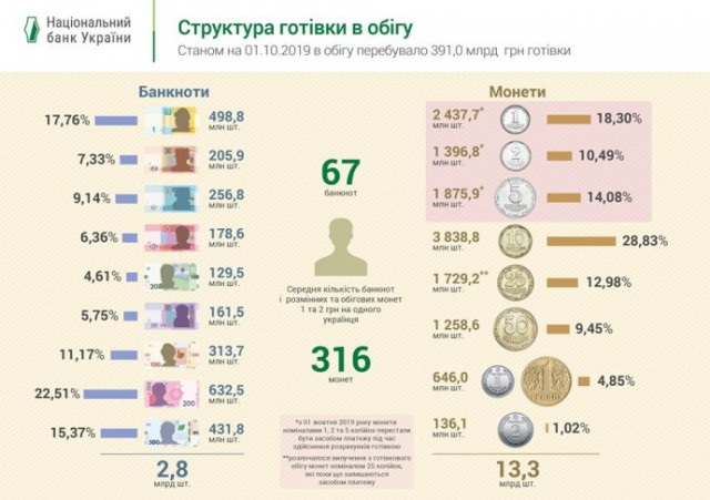 Зазначається, що станом на 1 жовтня у готівковому обігу перебувало 13,3 млрд штук монет (2,5 млрд грн) та 2,8 млрд штук банкнот (388,4 млрд грн).