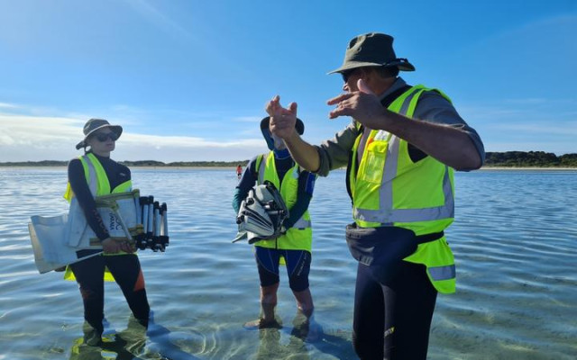 Рейнджери, які прибули на місце події, виявили 49 чорних дельфінів, заблокованих на мілині віддаленої коси Феруелл-спіт в затоці Голден Бей.